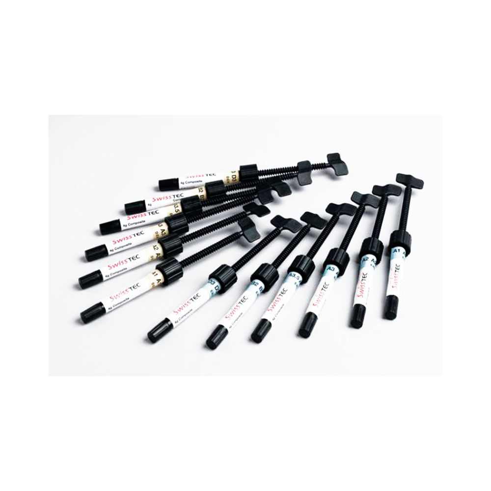 SwissTEC Composite is a syringeable, sculptable, radiopaque, highly filled fine hybrid composite which is cured in the tooth cavity or on the model with visible halogen light (Coltène® ColTolux).