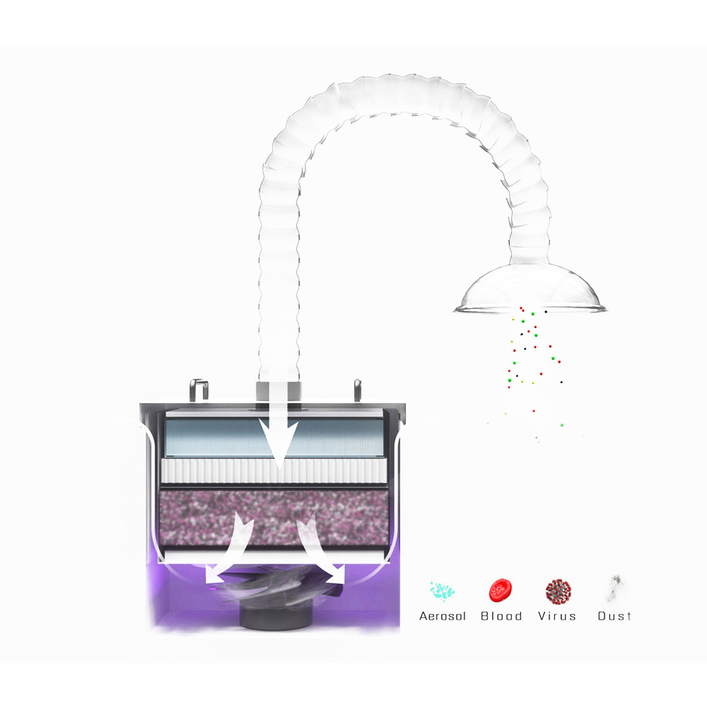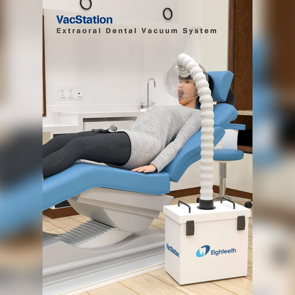 VacStation Extra-oral Dental Suction System has been developed by Eighteeth to reduce the risk associated with airborne particulates and pathogens present in an aerosol spray that is an inherent part of dental care.