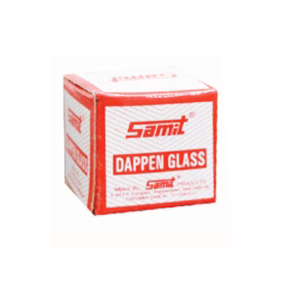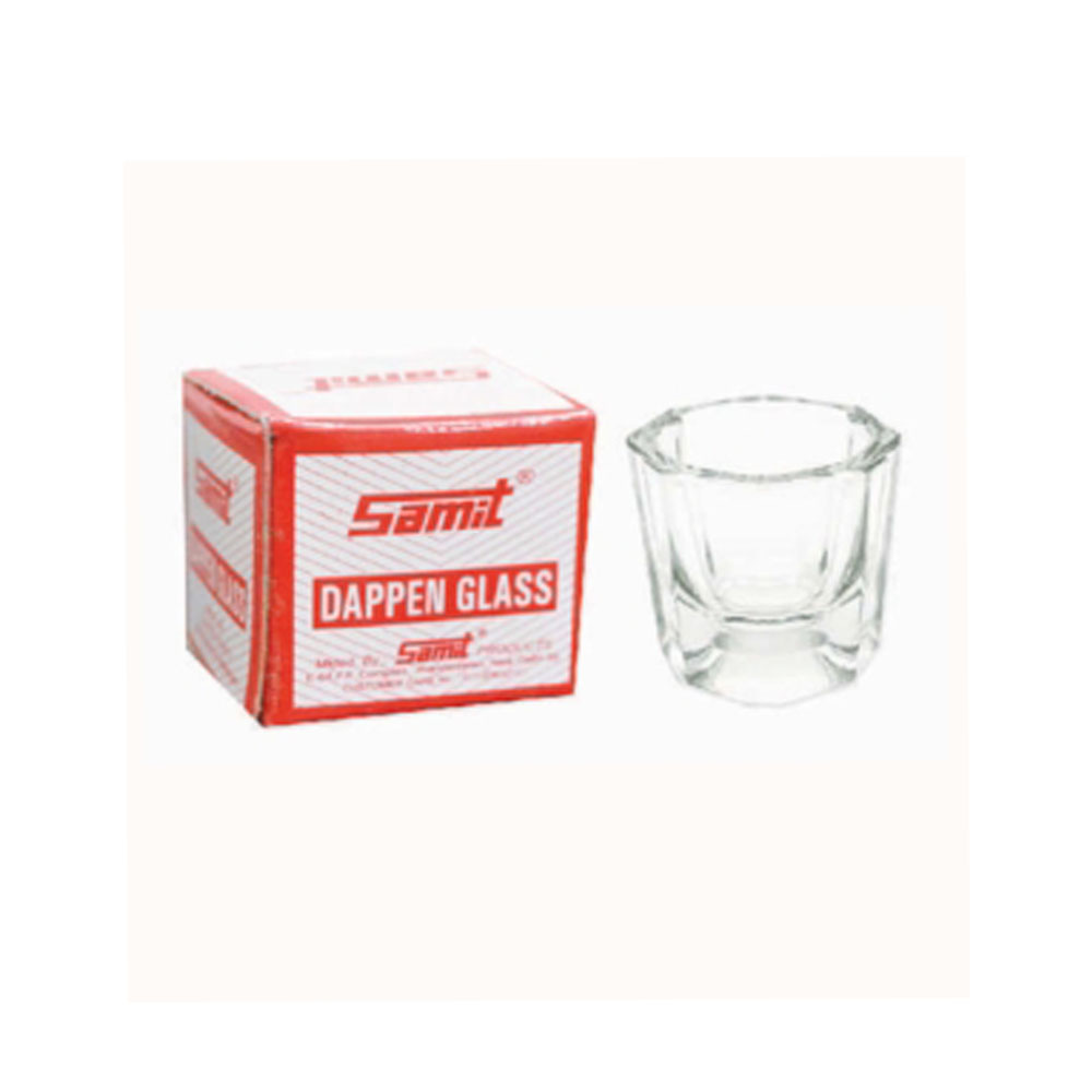 A dappen glass (also called Dappen Dish) is a small, dense glass vessel which has each end ground or hollowed out to provide a bowl for mixing substances.